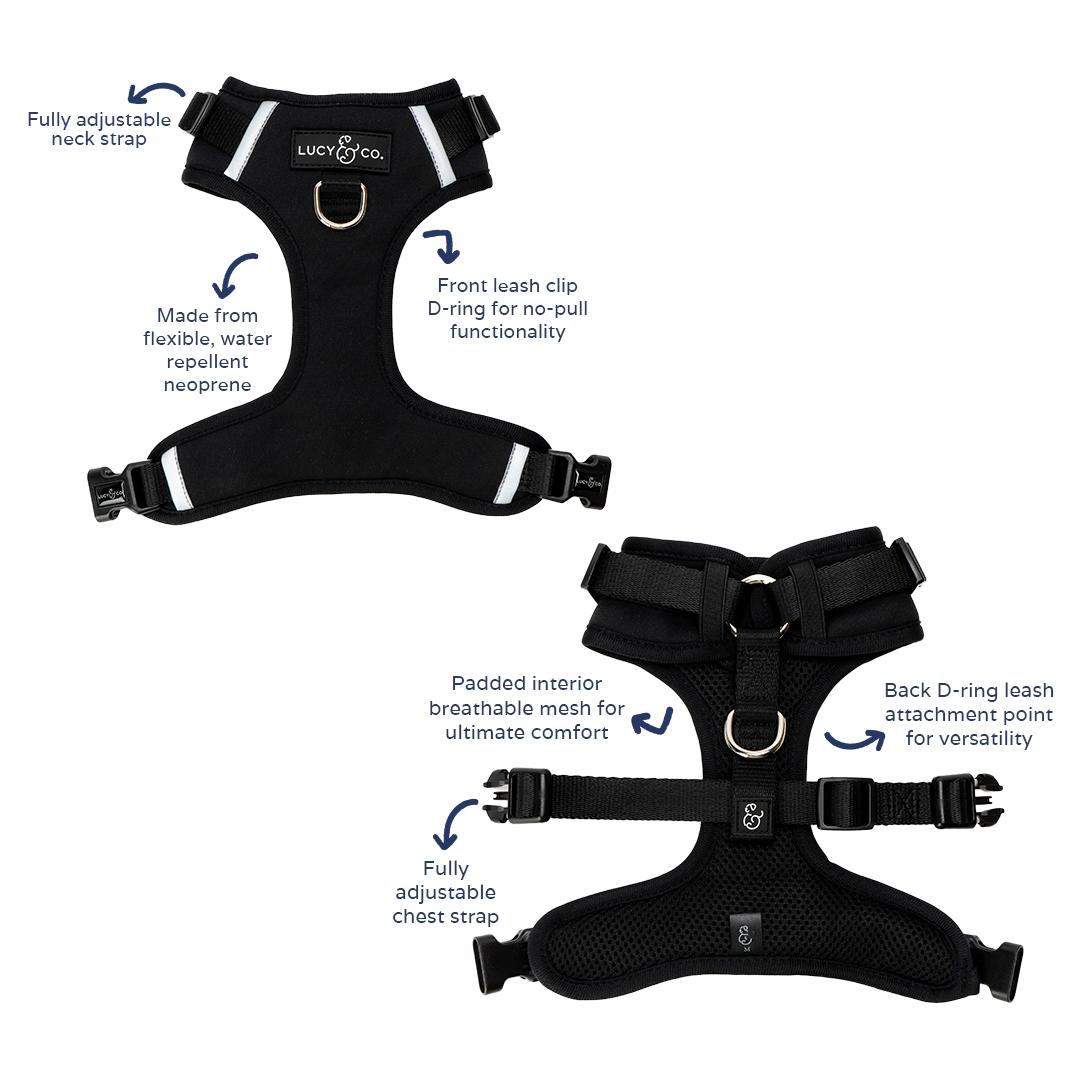 Just like our other gear, these harnesses have been designed with the on the go pup in mind. Our no-pull harnesses are made of our signature water-resistant neoprene and include extra padding and interior breathable mesh for ultimate flexibility and comfort.