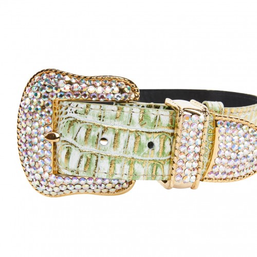 Luxury Pet Fashion Green/Gold Embossed Croc Italian Leather/Swarovski Crystal Collar