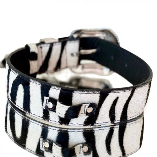 Luxury Pet Fashion Zebra Print Hair On Hide Italian Leather Collar With Classic Hardware