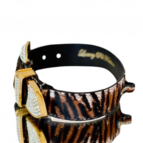 Luxury Pet Fashion Tiger Print Hair On Hide Italian Leather Collar With Swarovski Crystal Hardware