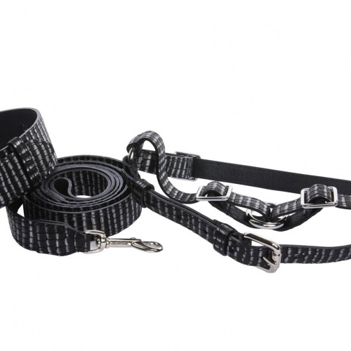 Black & Silver Striped Italian Leather Classic Collar, Leash & Harness Set With Silver Hardware