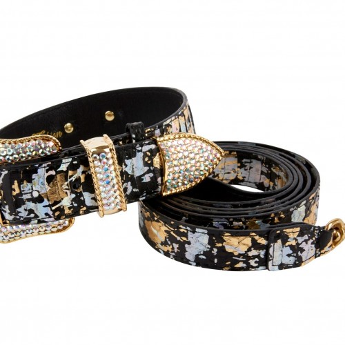 Black, Gold, Silver Iridescent Snake Collar & Leash Set With Swarovski Crystal Hardware