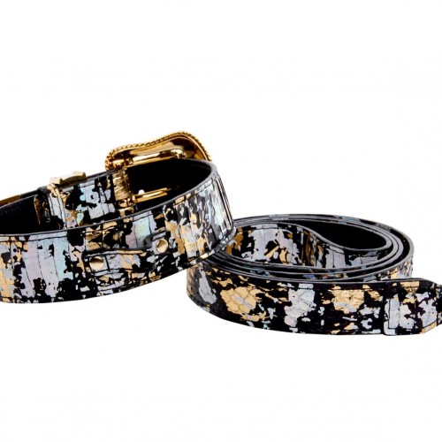 Black, Gold, Silver Iridescent Snake Collar & Leash Set With Swarovski Crystal Hardware