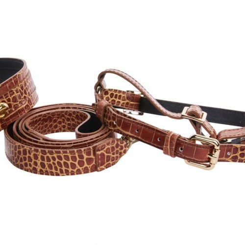 Brown & Gold Embossed Croc Italian Leather 3 piece Italian Hardware Collar, Leash, Harness Set