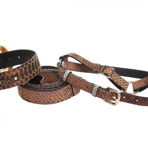 Brown Snake Print Hair On Hide Italian Leather With Classic Hardware Collar & Leash Set