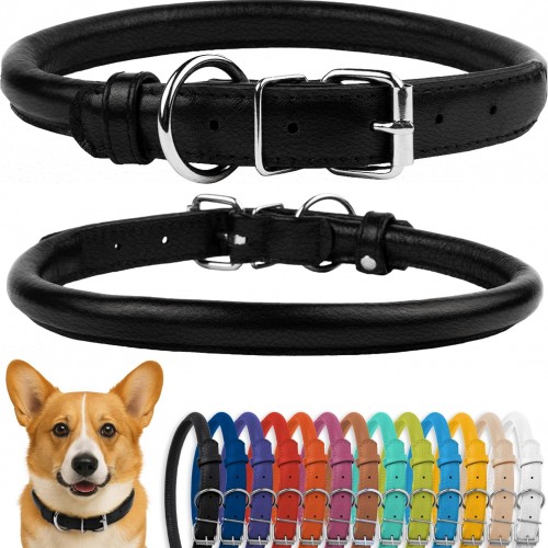 CollarDirect Rolled Leather Dog Collar, Soft Padded Round Puppy Collar, Handmade Genuine Leather Collar Dog Small Large Cat Collars 13 Colors (11-14 Inch, Black Smooth)