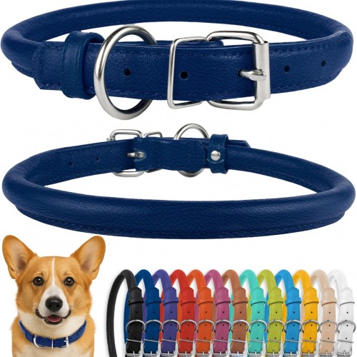 CollarDirect Rolled Leather Dog Collar, Soft Padded Round Puppy Collar, Handmade Genuine Leather Collar Dog Small Large Cat Collars 13 Colors (13-16 Inch, Deep Blue Smooth)