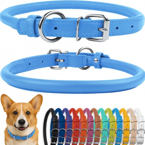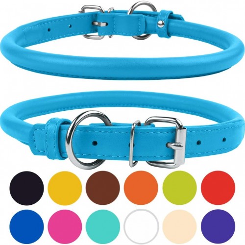 CollarDirect Rolled Leather Dog Collar, Soft Padded Round Puppy Collar, Handmade Genuine Leather Collar Dog Small Large Cat Collars 13 Colors (13-16 Inch, Light Blue)