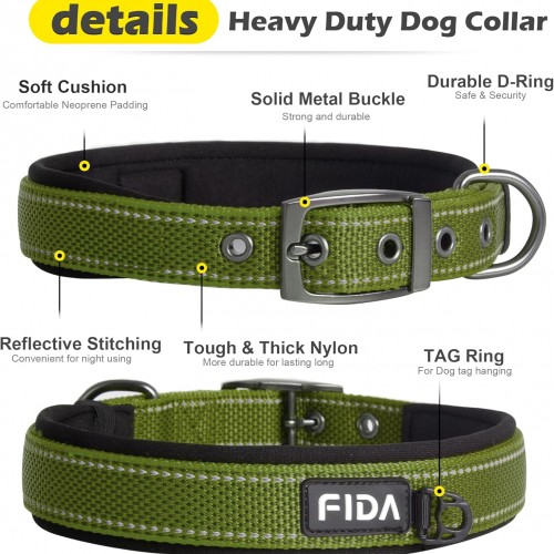 Fida Heavy Duty Dog Collar for Large Dogs, Ultra Comfortable Soft Neoprene Padded, Adjustable Reflective Nylon Pet Collar with Durable Metal Belt Buckle for Large Breeds (L, Green)
