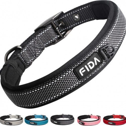 Fida Heavy Duty Dog Collar 1.5” Width, Ultra Soft Neoprene Padded, Adjustable Reflective Nylon Pet Collar with Two Metal Pin Belt Buckle for Large/X-Large Breeds (XL, Black)