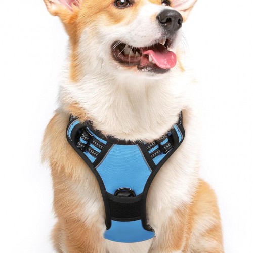 Eagloo Dog Harness Medium Sized, Easy Wearing with 3 Buckles, Adjustable No Pull Pet Harness with 2 Rings for Walking, No Chock Reflective Soft Padded Vest with Control Handle, Blue & Black, M