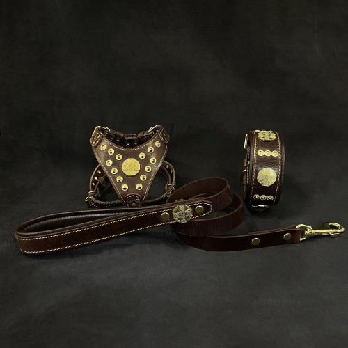 “Maximus Brown&Gold” Small dog SET – Harness – collar – lead