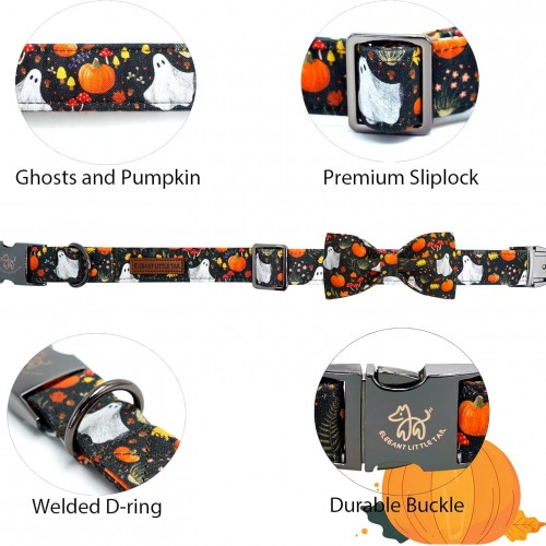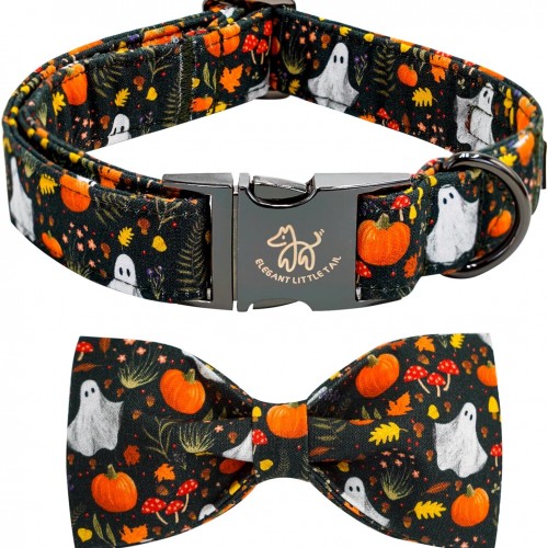 Elegant little tail Fall Dog Collars, Ghosts Pumpkin Print Halloween Pet Collar Puppy Male Cotton Dog Collar with Bow Adjustable Collars for Small Medium Large Dogs