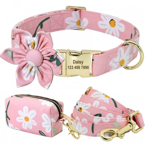 Pastel Pink Flower Dog Collar & Leash Set with Matching Poop Bag Case | Personalized Free