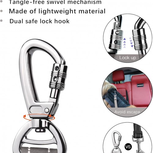 - Upgrade 360-degree Locking Carabiner – The new upgraded dual-safe locking carabiner clip is made from stainless steel designed to serve you through the weather. Premium zinc alloy swivel carabiner with a maximum tensile strength of 900 lbs can keep the dog stable during the car ride, enhance the security of pets and drivers while driving. The 360-degree rotatable clasp keeps your dog acting freely without strangling or tangling