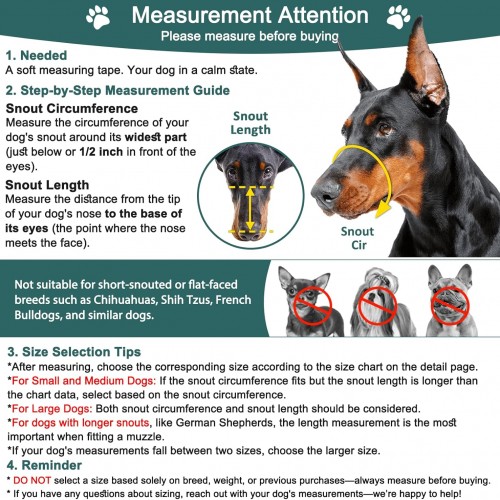 - Size 6 (Cir: 13.75-15.5”, length: 4-4.5”): This size 6 muzzle for large sized dog is perfect for breeds like German Shepherd, Cane Corso, etc. If between sizes, SIZE UP! Please measure twice your dog’s snout circumference and length according to the size chart or video guidance. Each basket muzzle for dogs comes with a detailed instruction manual, so before using the cage muzzle, please be sure to read it carefully, which is very helpful for you to use the muzzle (if you don’t do this, the usability of the product will be reduced by half)