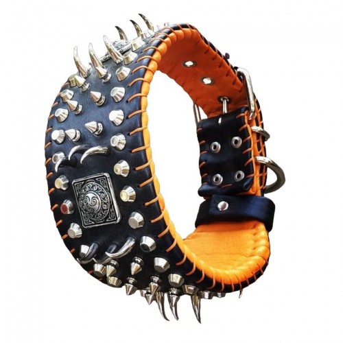 This collar is made out of 2 layers of leather. Very durable and comfortable for your dog to wear, as it is padded all around on the inside. The D-ring can be at the buckle or on top of the collar (not recommended for pulling dogs). The buckle is heavy duty, 5 cm (2 inch) wide.