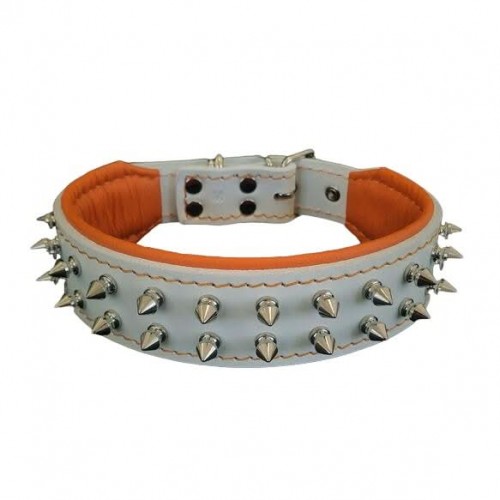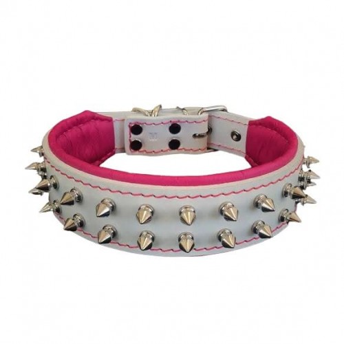 It has a decoration of 26 (up to 46) nickel plated short spikes. The buckle and D-ring are 30 mm (1.2 inch) wide. The total width of this collar is 5 cm (2 inch).