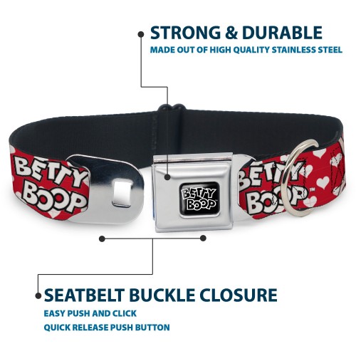BETTY BOOP Text Heart Logo Full Color Black/White Seatbelt Buckle Collar – BETTY BOOP Seated Leg Kick Pose and Text Hearts Red/White/Black