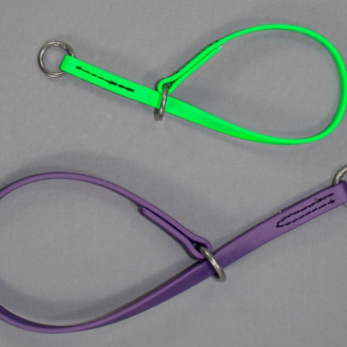 BioThane Slip Collars are waterproof, odor-proof, durable and will protect your dog’s coat. These collars are handmade in our shop with material made in the USA. BioThane is easy to clean and the collars won’t hold water so your dog’s coat will dry quickly. We offer these collars in two widths and multiple lengths as well as 11 fun colors! Questions on sizing the BioThane Slip Collars? Visit our sizing page!