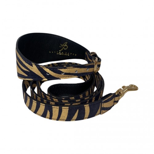 Black & Gold Zebra Print Italian Leather Collar & Leash Set