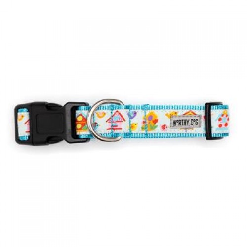 Adjustable collars focused on durability and style, featuring woven ribbon sewn onto comfortable and strong nylon webbing with snap clasp and nickel-plated hardware.