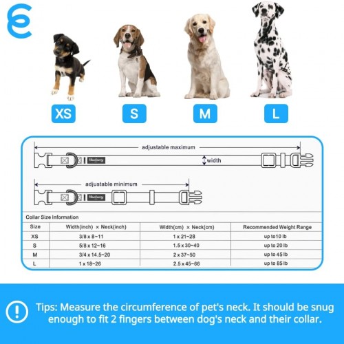 - Neck 14.5″-20″, Width 3/4″, Size Medium dog collar; This collar for dogs does not stretch itself, please make sure leave ONLY 2 fingers between the adjustable dog collar and dog neck. A properly fitting and comfortable dog collar and harness won’t leave any room for your dog to chew. The collar dog is not for tie out. NEVER leave your dog unattended with a collar on