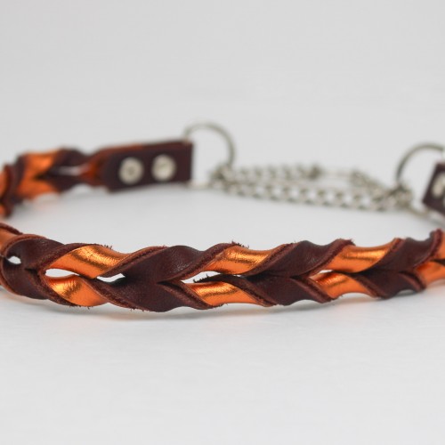 The Braided Leather Non Adjustable Martingale Collar should slip easily over the dog’s head, but not slip back over when the chain is taut. Measure the widest part of your dog’s head to ensure the collar will slip over the head and adjust comfortably around the neck. Contact us if you have sizing questions. Please measure using line #1 on our guide to assure an accurate fit. Go up to the closest size.