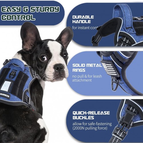 BUMBIN Tactical Dog Harness for Large Dogs No Pull, Famous TIK Tok No Pull Puppy Harness, Fit Smart Reflective Pet Walking Harness for Training, Adjustable Dog Vest Harness with Handle Denim Blue L