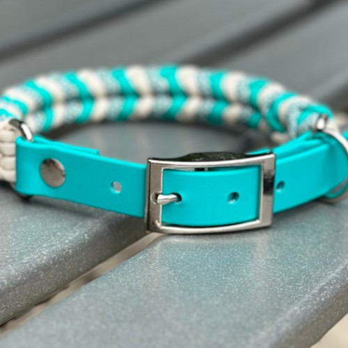 This Coiled Charm Hand Braided Dog Collar is woven in a teal, cream, and teal diamonds pattern, and has a teal adjustable strap with a belt style nickel plated buckle.