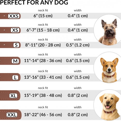 - SUITABLE FOR ALL BREEDS: Our dog collars for small dogs and big dogs come in a variety of sizes. Please check out our size chart before purchasing a leather collar for dogs. The dog collar leather is 0.6 inches wide, 17 inches long, and neck sizes of 12 – 15 inches.