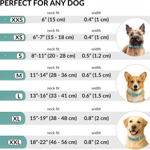 - SUITABLE FOR ALL BREEDS: Our dog collars for small dogs and big dogs come in a variety of sizes. Please check out our size chart before purchasing a leather collar for dogs. The dog collar leather is 0.8 inches wide, 21 inches long, and neck sizes of 16 – 20 inches.