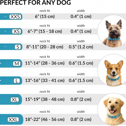 - SUITABLE FOR ALL BREEDS: Our dog collars for small dogs and big dogs come in a variety of sizes. Please check out our size chart before purchasing a leather collar for dogs. The dog collar leather is 0.8 inches wide, 25 inches long, and neck sizes of 18 – 22 inches.