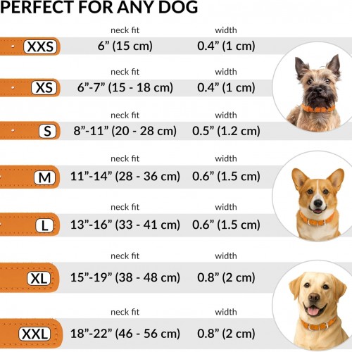 - SUITABLE FOR ALL BREEDS: Our dog collars for small dogs and big dogs come in a variety of sizes. Please check out our size chart before purchasing a leather collar for dogs. The dog collar leather is 0.4 inches wide, 10 inches long, and neck sizes of 6 – 7 inches.