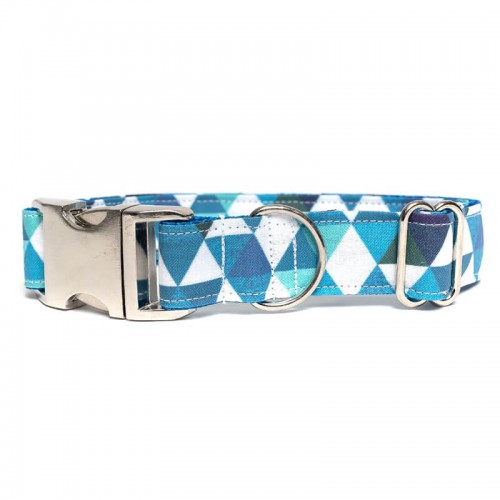 Cotton fabric sewn onto nylon webbing for extra durability. Solid silver colored metal hardware and metal D-ring.