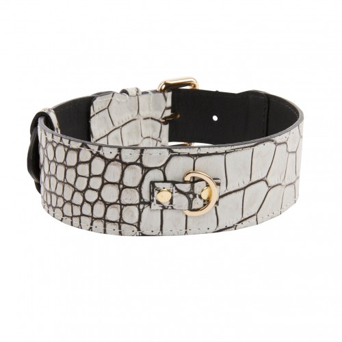 Be the first to review “Dark Brown/Off White Embossed Croc Italian Leather Classic Collar With Gold Classic Hardware” Cancel reply