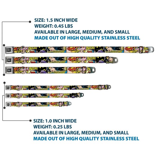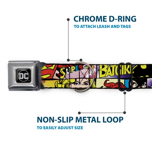 Your dog will be the talk of the town when people notice they’re wearing this awesome SeatBelt Dog Collar! Made from high-density polyester and durable steel components, this collar is built to last. It features beautiful vibrant artwork. The buckle is a miniature authentic SeatBelt Buckle, so you press the center button to release the clasp. This product is Made in USA by Buckle-Down Inc. and officially licensed by DC Comics.