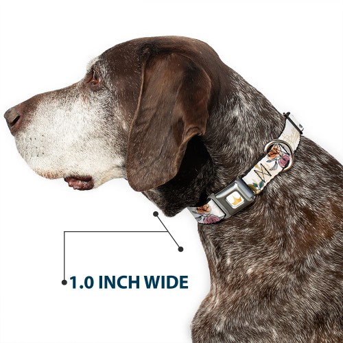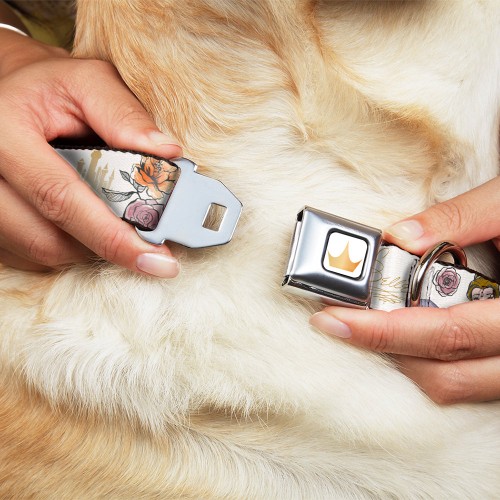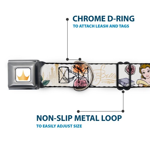 Disney Princess Crown Full Color Golds Seatbelt Buckle Collar – Beauty and the Beast Belle Castle Pose with Script and Flowers White/Yellows