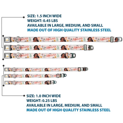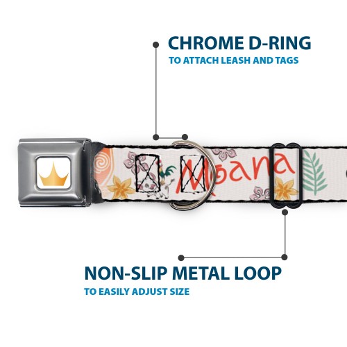 Disney Princess Crown Full Color Golds Seatbelt Buckle Collar – Moana with Pua and Hei Hei Sail Pose with Script and Flowers Beige/Orange