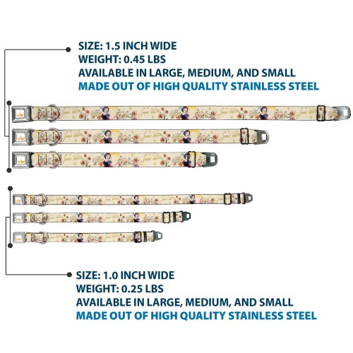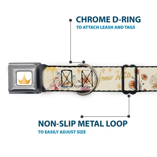 Disney Princess Crown Full Color Golds Seatbelt Buckle Collar – Snow White and the Seven Dwarfs with Script and Flowers Yellows