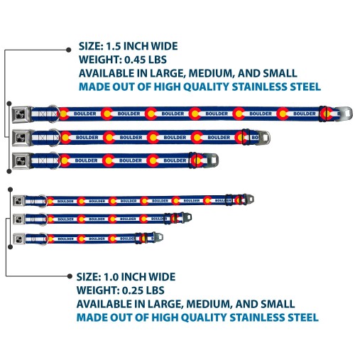 Dog Bone Black/Silver Seatbelt Buckle Collar – Colorado BOULDER Flag Blue/White/Red/Yellow