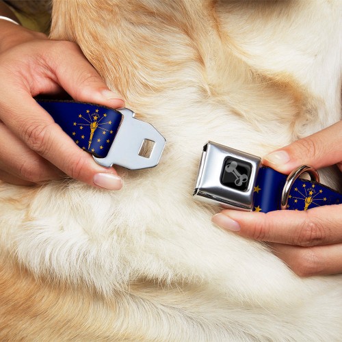 Dog Bone Black/Silver Seatbelt Buckle Collar – Indiana Flag/Torch CLOSE-UP Navy Blue/Gold
