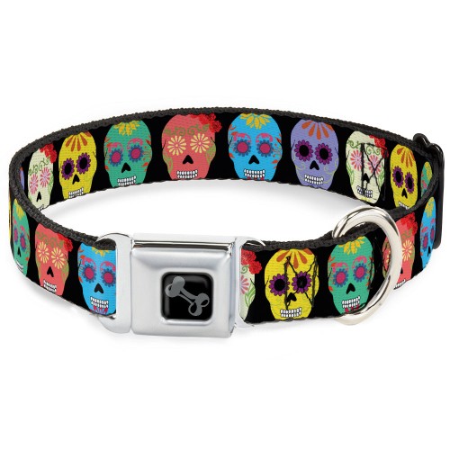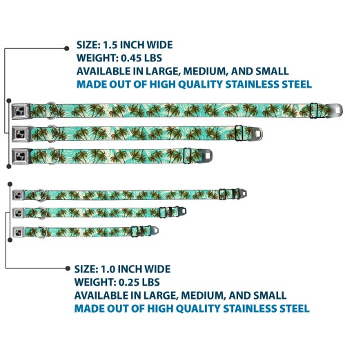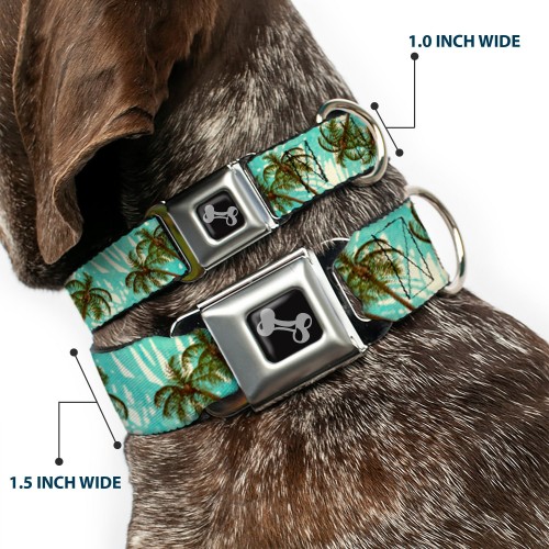 Dog Bone Black/Silver Seatbelt Buckle Collar – Palm Trees Swaying Tan/Teal