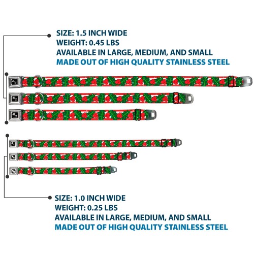 Dog Bone Black/Silver Seatbelt Buckle Collar – Snowy Holly Stripe Reds/White/Greens