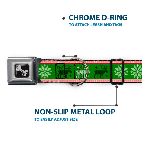 Dog Bone Seatbelt Buckle Collar – Christmas Stitch Moose/Snowflakes Red/Green