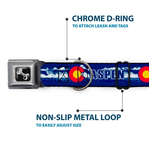Dog Bone Seatbelt Buckle Collar – Colorado ASPEN Flag/Snowy Mountains Weathered2 Blue/White/Red/Yellows