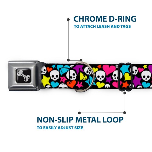 Dog Bone Seatbelt Buckle Collar – Funky Skulls Hearts & Stars Black/Multi Color