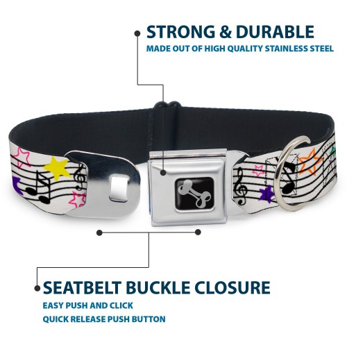 Dog Bone Seatbelt Buckle Collar – Music Notes Stars White/Black/Multi Color