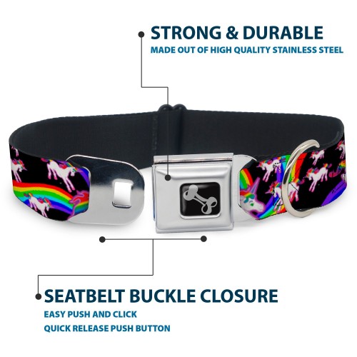 Dog Bone Seatbelt Buckle Collar – Unicorns/Rainbow Swirl Black
