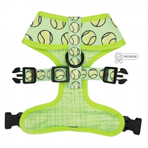 Fetch me if you can! Your pup will be fast as a speedy tennis ball in this gorgeous bright green reversible harness with tennis balls on one side and solid green on the other!